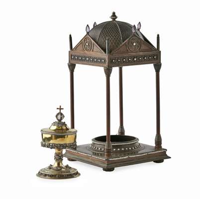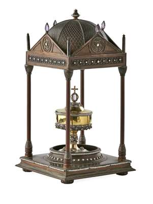 set with cut stones and cabochons and further decorated with leafy chasing, bears inscription under foot IN MEM. STR. HENRIETTA MARIA/ STR. ETHELRED/ E.A. HOUBLON/ E.J. FORBES/ KATE CROWE/ R.I.P./ A.D. 1917, hallmarked London 1917, 14cm high; contained within a copper canopy, with domed top supported on columns, chased decoration set with cut stones, 32cm high (2)