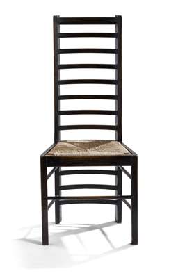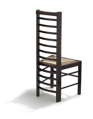 Note: Mackintosh had produced versions of the traditional ladderback chair before, first for David Gauld in 1893 and then as a bedroom chair at Windyhill in 1901. This understated and deceptively simple design of 1903, for Miss Cranston's new Willow Tearooms in Sauchiehall Street, is his most successful treatment of this vernacular form. The dark wood against by the pale walls and tablecloths of the tearoom interiors accentuating the striking lines of this, one of Mackintosh's most recognisable chairs.