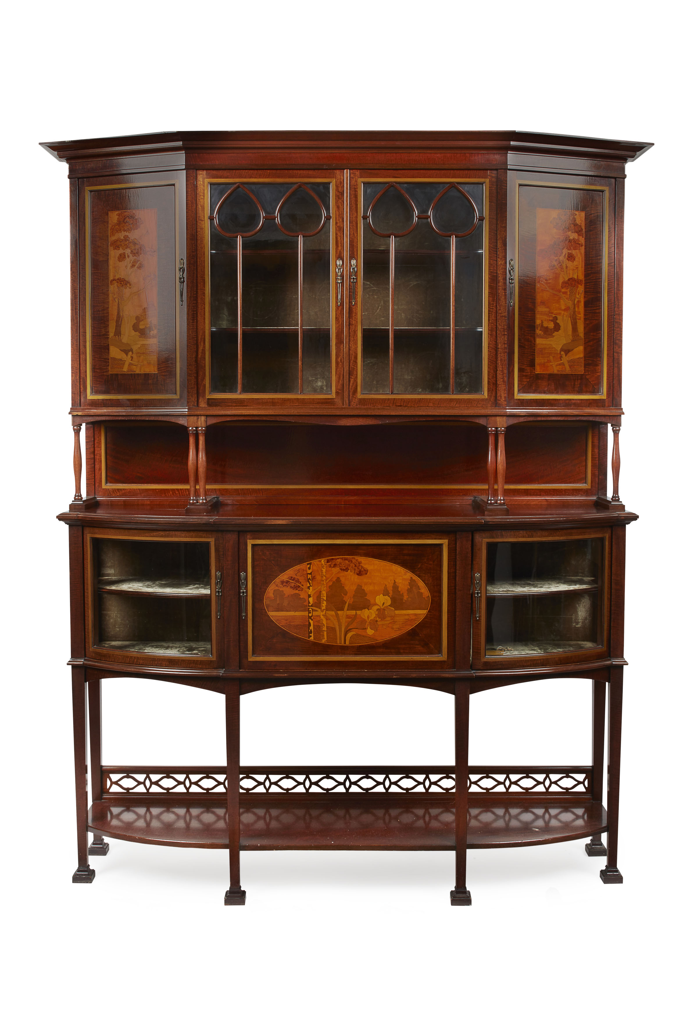 the canted superstructure with two glazed doors with stylised bud astragals, flanked by doors with marquetry landscape panels, and supported on twin columns, the base with central corresponding inlaid door with flanking glazed doors, galleried platform stretcher, bears label A GARDNER AND SON, CABINET MAKERS, GLASGOW