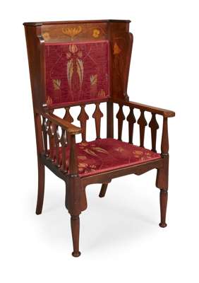 ART NOUVEAU MAHOGANY AND MARQUETRY INLAID WING ARMCHAIR
