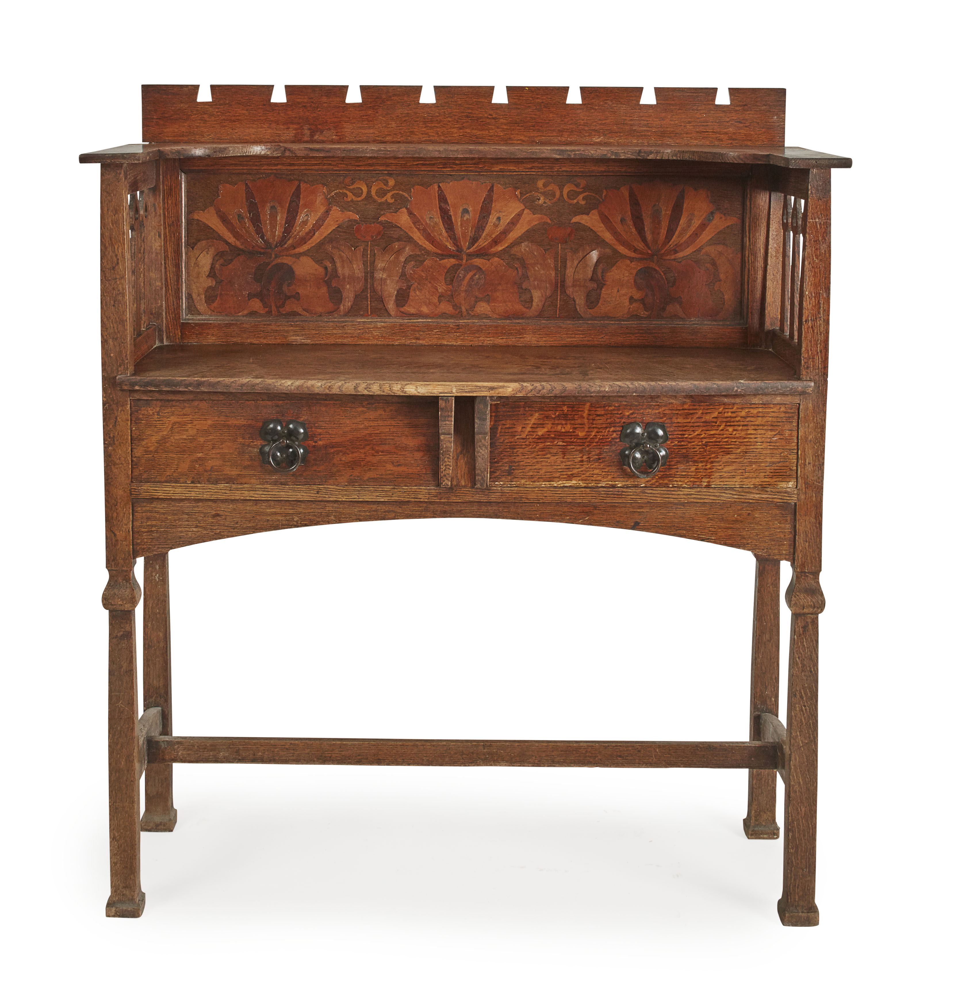 the castellated upstand with open shelf and inlaid back above a bowed top with two drawers below on square tapered supports linked by stretchers