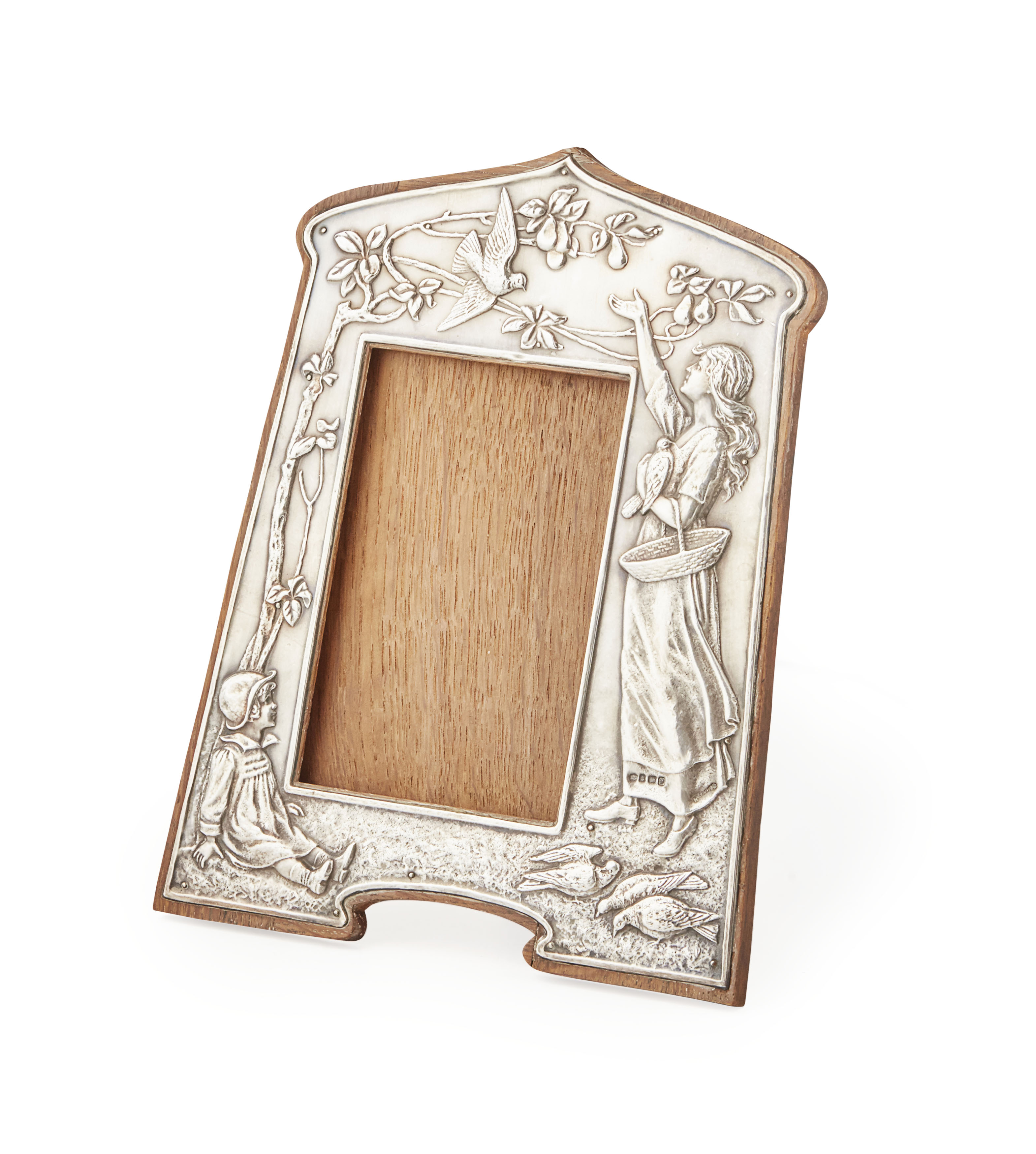 die-stamped to one side with a girl feeding birds from a basket, the other side with a seated child at the foot of a tree whose branches hung with pears spread across top of frame, wood easel back, hallmarked Birmingham 1905
