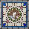 of square form, with coloured glass panels enclosing a painted roundel depicting a female figure with flowers