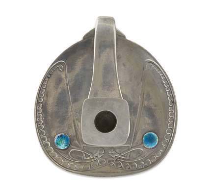 of circular outline, the candle sconce with removable nozzle, the tray cast with stylised seeds and plant tendrils, and set with two turquoise enamel roundels, stamped marks TUDRIC/ 0523