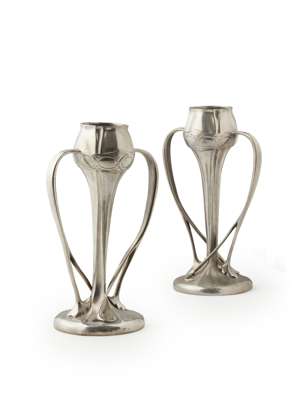 PAIR OF 'TUDRIC' TWIN-HANDLED PEWTER VASES, CIRCA 1900