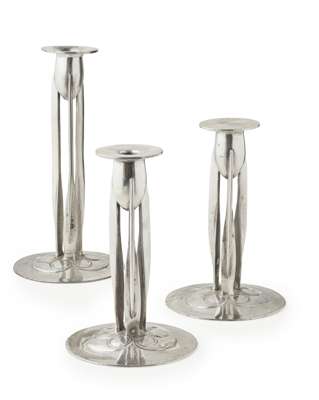 'TUDRIC' PEWTER CANDLESTICK GARNITURE, CIRCA 1905