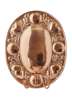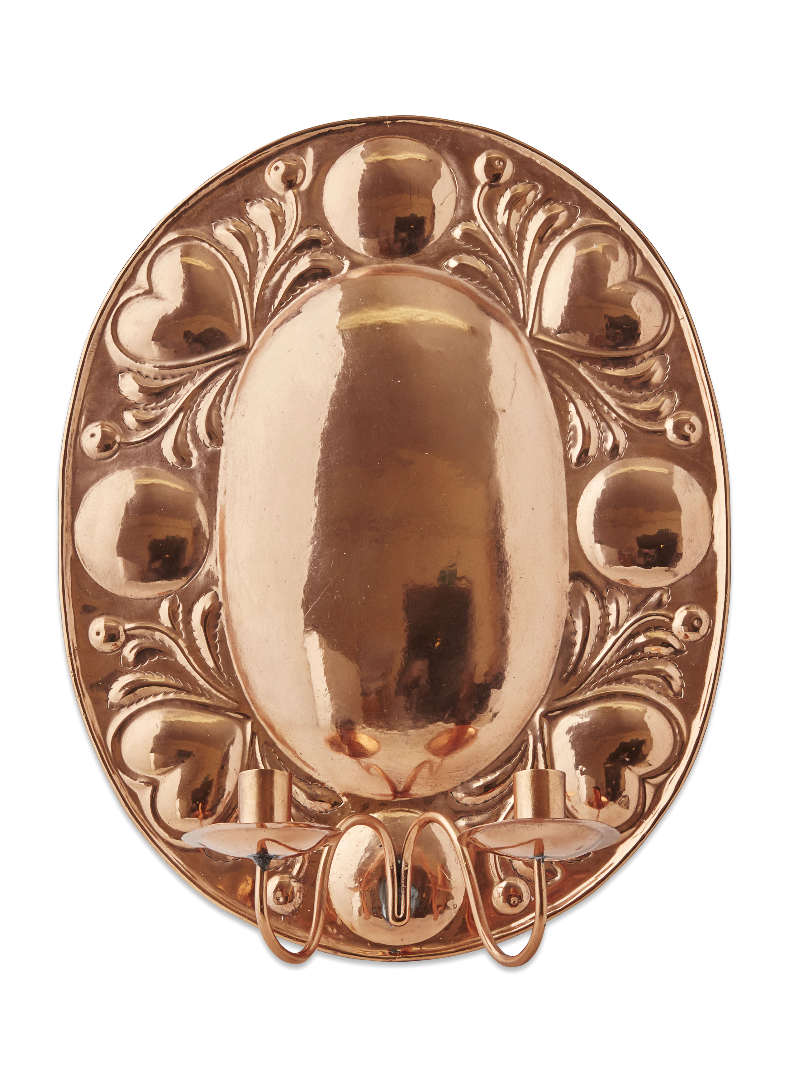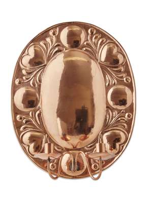 of oval outline, repousse decorated with a band of foliate motifs, hearts and spheres, with two candle arms