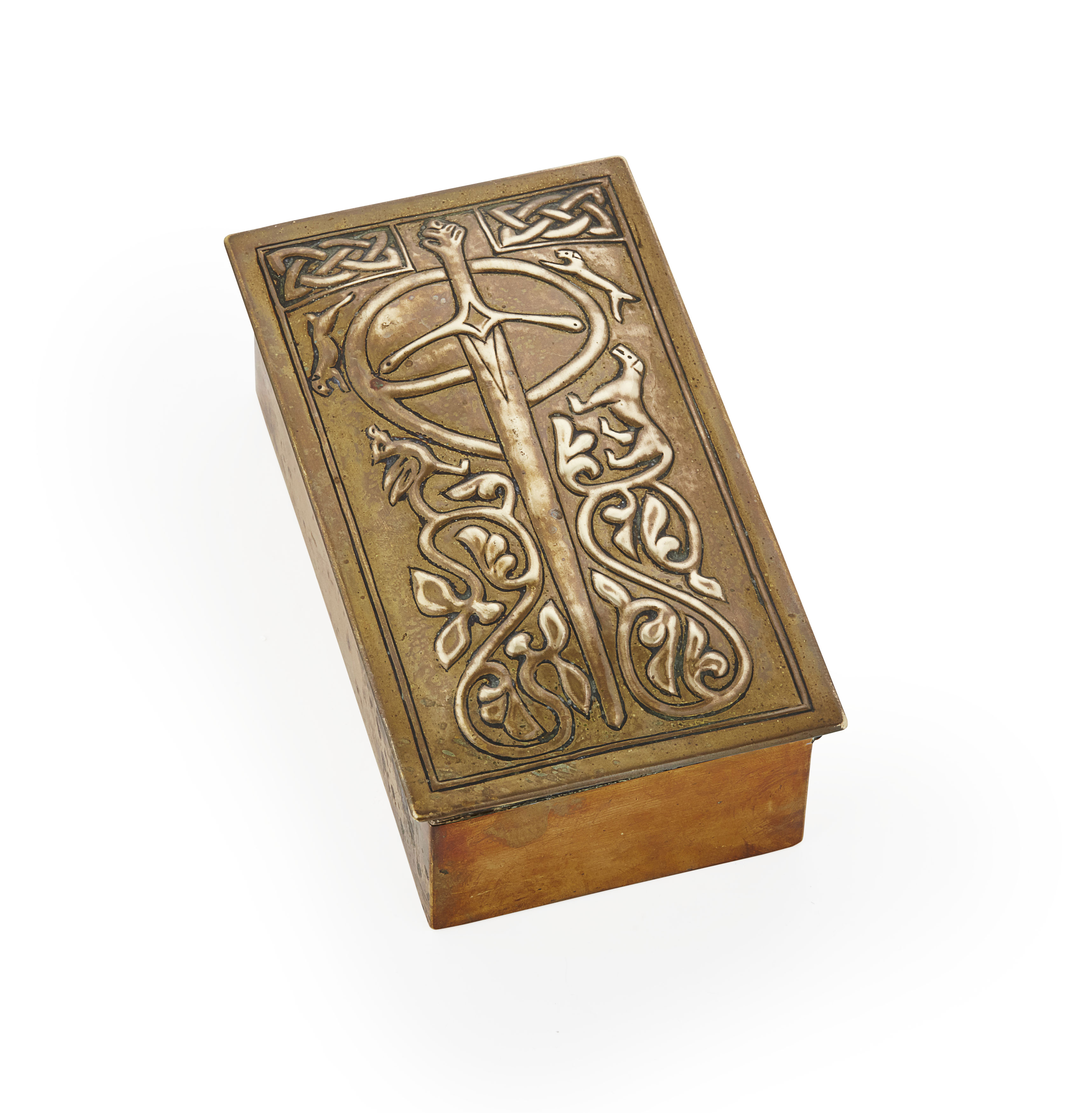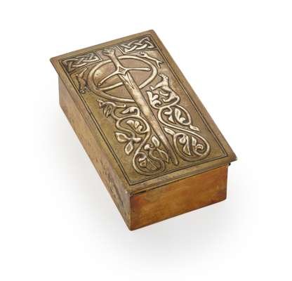 of rectangular form, the hinged cover decorated with a sword, running dogs and griffins amongst knotwork