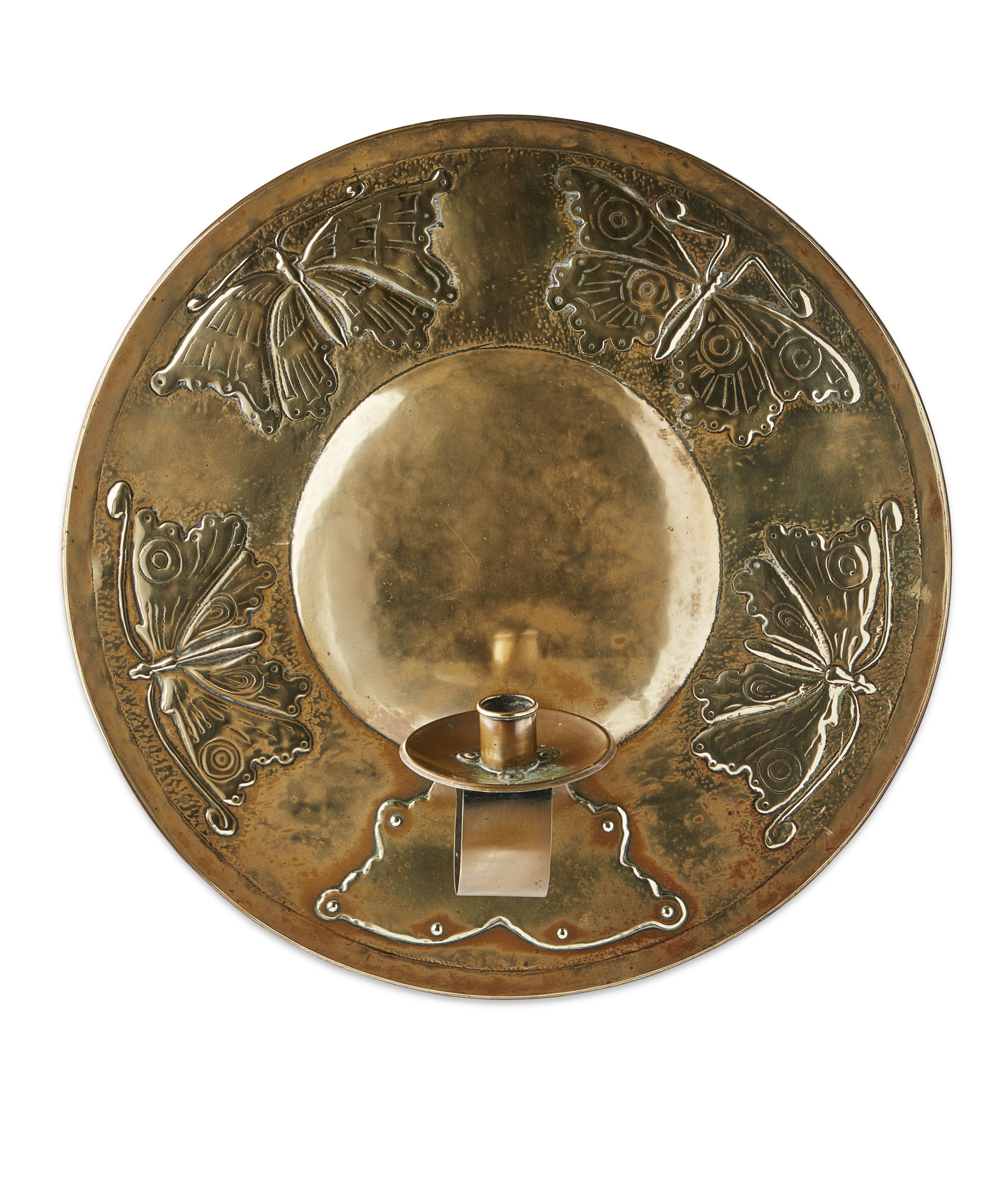 of circular outline with applied single candle arm and repoussé decoration depicting a band of butterflies