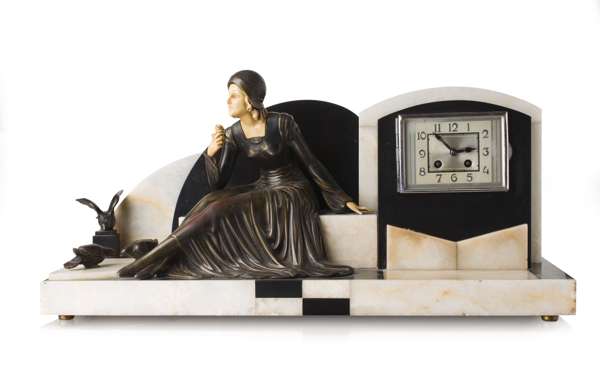 the rectangular dial on a stepped marble and slate case surmounted by the patinated spelter figure