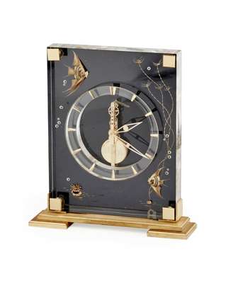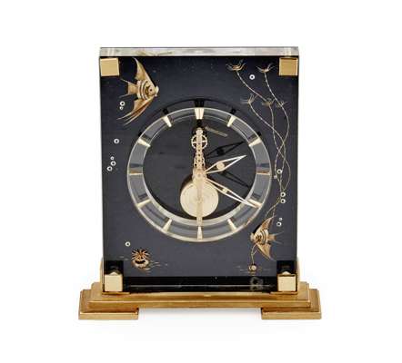 the clear Perspex case mounted with an aquarium scene on a black back on lacquered brass mounts, the chapter ring with baton markers to an exposed and jewelled movement, original box