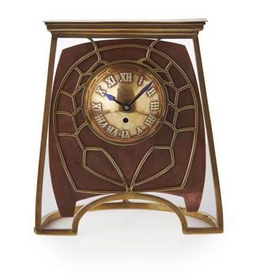 the single train movement within spherical case with cast numerals within easel frame with pierced fret and copper backplate