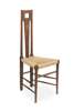 the tall back with pierced top rail and central splat, raised above rushed seat on tapered legs linked by stretchers