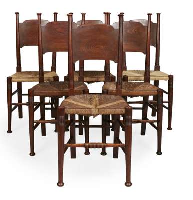 each with broad backs with turned and reeded uprights above rush seats on corresponding turned legs linked by stretchers (6)