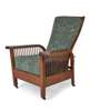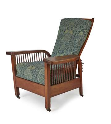 with an adjustable reclining back, the back and seat with loose cushions, the broad arms with spindle-filled panels, raised on square section legs