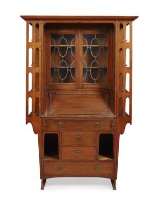 with twin glazed and leaded doors flanked by decorative pierced brackets and above a sloping fall with arrangement of drawers and shelves below