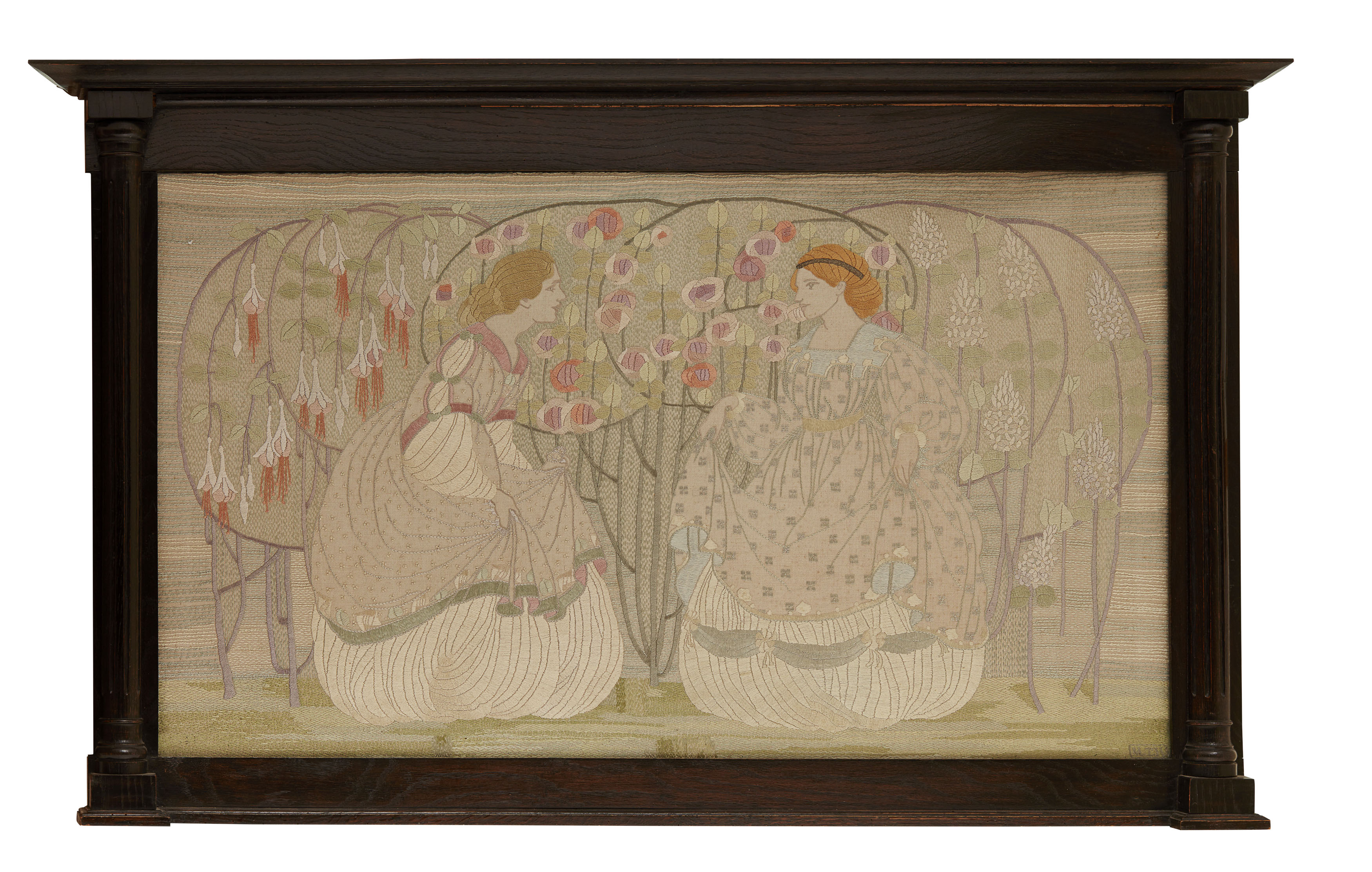 the panel depicting two maidens in a garden bower of wisteria, roses and fuchsias, the whole enclosed within stained oak frame, bears embroidered initials MTH