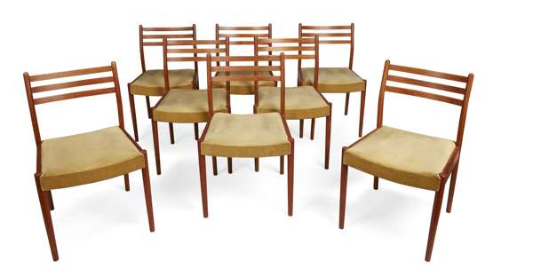 the rectangular top with rounded angles, raised on tapering legs with stretchers, 182cm long (closed), 244cm long (extended, 73cm high, 88cm deep; also a SET OF EIGHT 'AUSTINSUITE' TEAK DINING CHAIRS, each with slatted backs and upholstered seats, 48cm wide, 80cm high, 45cm deep (9)