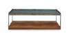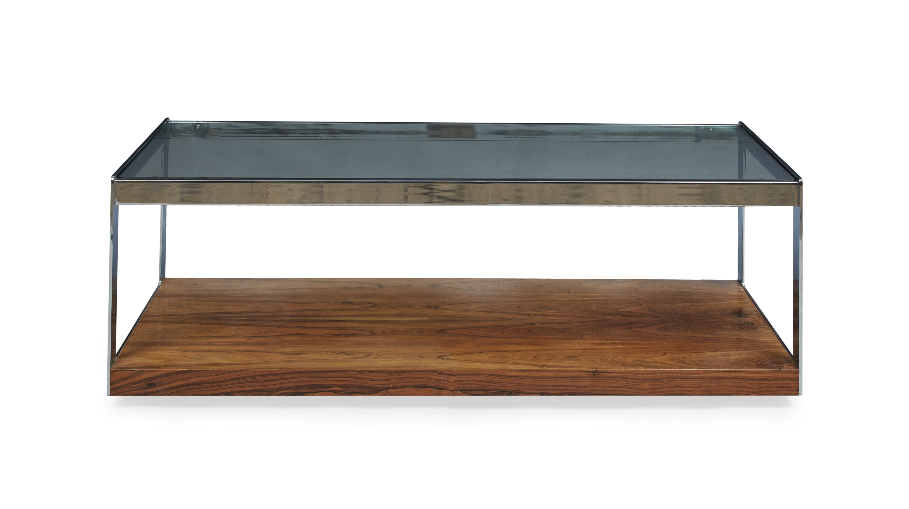 the rectangular glass top on chrome supports linked by a rosewood platform
