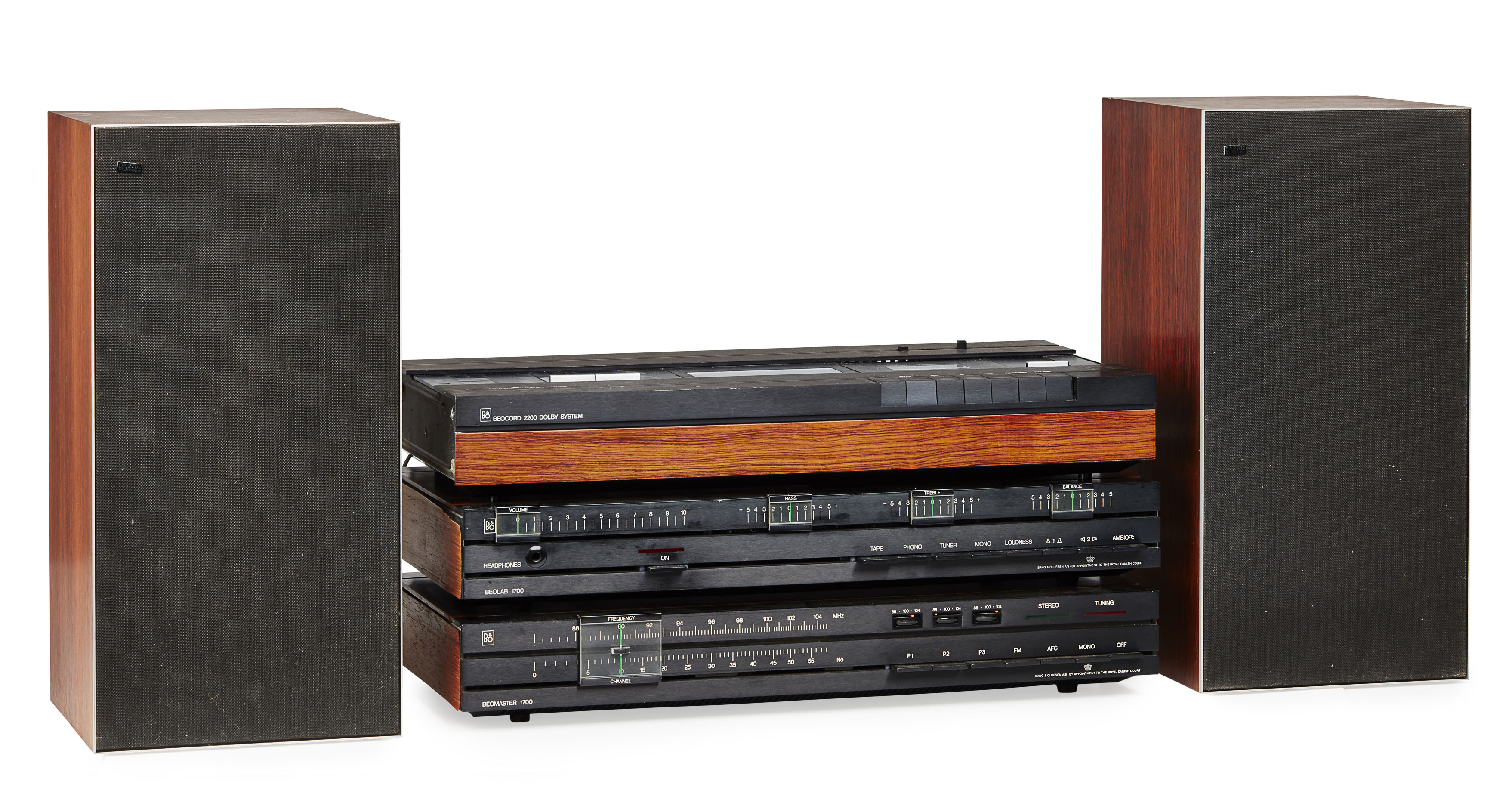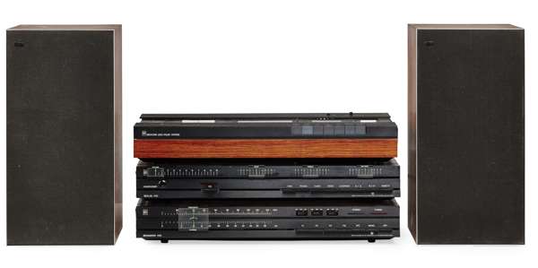 to include; a stereo system, with CD and tape player, a Beolab amp, a Beomaster tuner, a Beogram deck, Wharfedale loudspeakers and a Bang & Olufsen TV