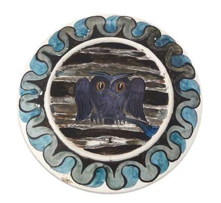 painted in blue and black on a gilt ground with a fruiting tree flanked by shields and serpents, the reverse painted with an owl on a branch within a waved border, bears artist's monogram