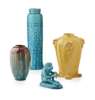the figure glazed in turquoise on a naturalistic oval base, impressed marks BURMANTOFTS/ FAIENCE/ 752, 15cm high; a BURMANTOFTS FAIENCE VASE, covered in a turquoise glaze and decorated with an impressed cracked ice design, impressed marks BURMANTOFTS/ FAIENCE/ 1397, hairline crack, 42.5cm high; a BURMANTOFTS SHOULDERED VASE, covered in streaked rust and turquoise glazes, impressed maker's marks BURMANTOFTS 110, 22cm high; and a MIDDLETONS POTTERY VASE, moulded with owl masks and covered in a mustard yellow glaze, impressed mark NIDDLETON/ LEEDS/ ENGLAND, No. 22, 28cm high (4)