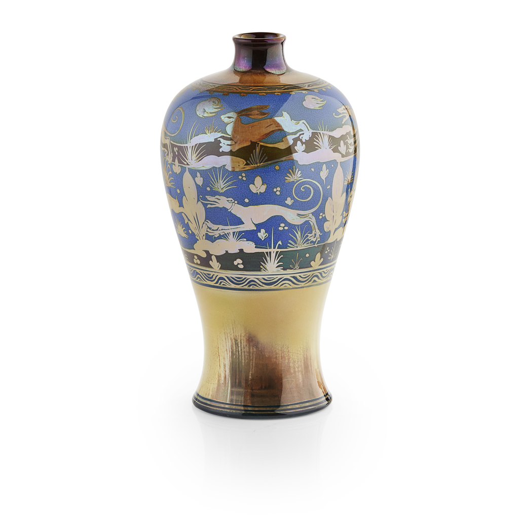 decorated with a frieze of greyhounds chasing hares in a landscape, reserved on a pale blue ground, impressed maker's marks, painted artist's monogram and date mark