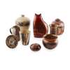 comprising a KATIE HORSEMAN (1911-1988) POTTERY CAT, with lustre stripes, 31.5cm high; a POT, with vertical stripe decoration, signed KATIE H, 15.5cm high; a DAVID HEMINSLEY (1927-2007) PIERCED POT, with tenmoku glaze, incised D.H., 11.5cm diameter; a POT, incised CECILE, 13cm high; a SALTGLAZE JUG, with three incised lines, 18cm high; a SALTGLAZE POT, with applied painted decoration, indistinct painted mark, 22cm high; a SALTGLAZE VASE, of shouldered form, indistinct painted mark, 27.5cm high; a SAUCER, with stylised birds, unmarked, 14.5cm diameter; and a VASE, with everted rim, unmarked, 20cm high (9)