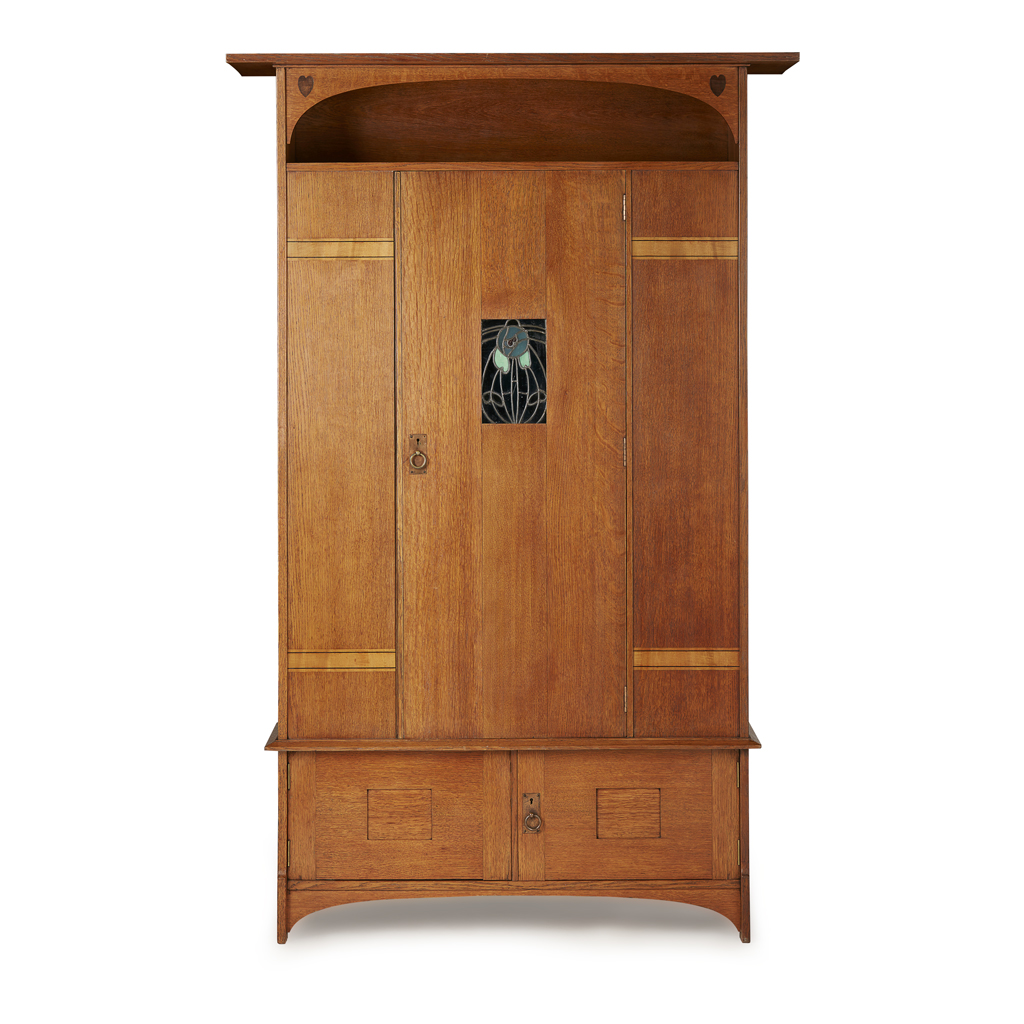with plank cornice above open shelf and single door inset with stained and leaded glass panel, above two further doors on stile supports, bears maker's label, stamped serial no. 1/16663