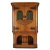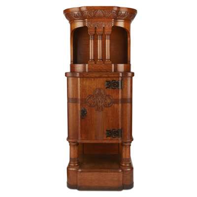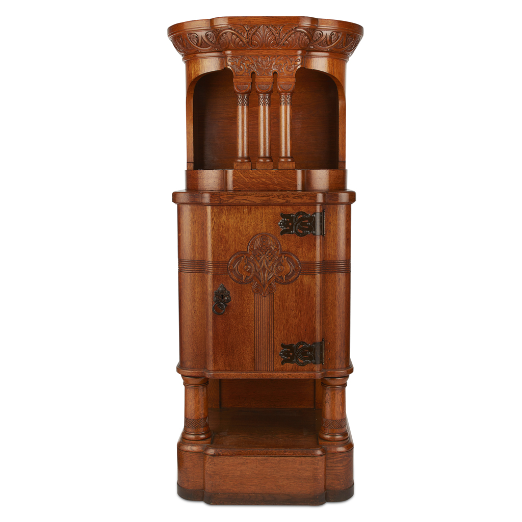 the carved projecting cornice with Celtic knot and mask decoration above two doors with stained and leaded glass panels, decorative hinges and decorative carving above an open shelf with three column supports, the whole raised on a plinth, 139cm wide, 217cm high, 55cm deep; and a MATCHING COMPANION CELTIC REVIVAL CABINET, with open shelf and single cupboard below, raised on turned supports on a plinth, 69cm wide, 181cm high, 53cm deep (2)