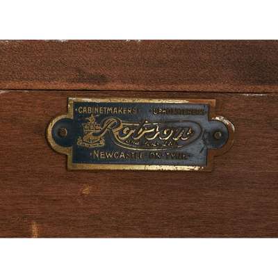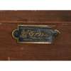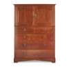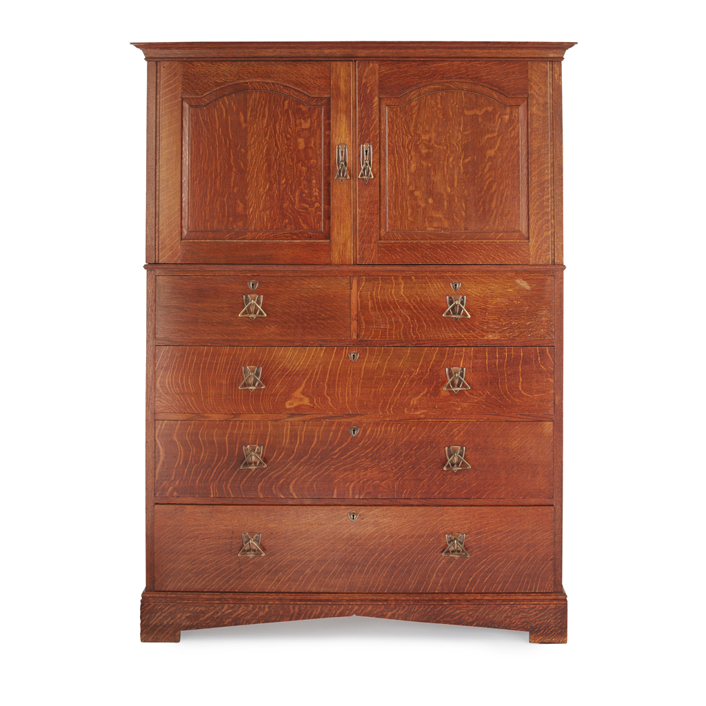 the projecting cornice above two panelled doors enclosing a shelved interior and two short over three long drawers on bracket feet, bears retailer's label