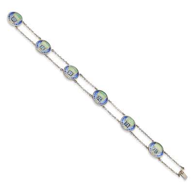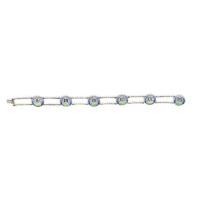 comprising six circular panels in blue and green enamels with stylised floral motifs, linked by double chains