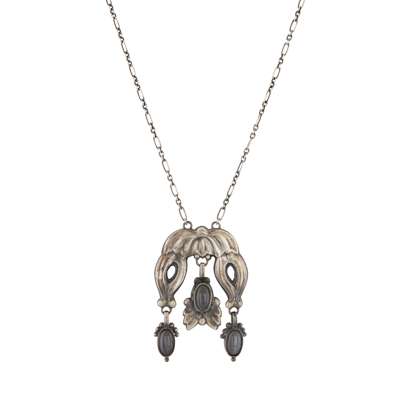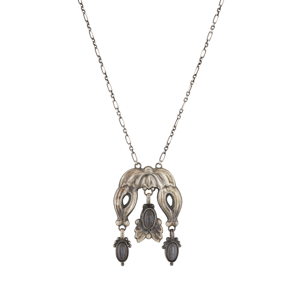 the bud motifs set with moonstone cabochons, suspended from paperclip chain, stamped makers marks GEORG JENSEN/ 830S/ 17