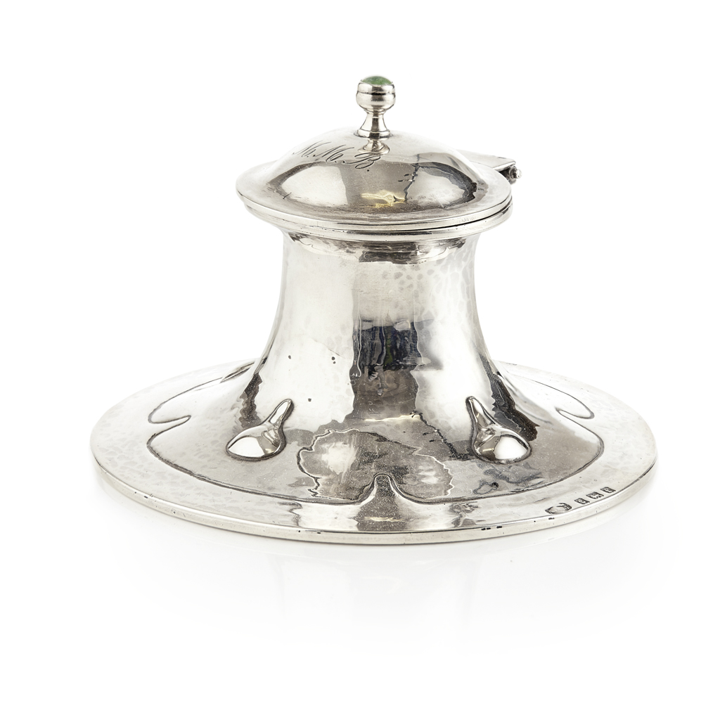 the hinged cover fitted with a cabochon finial and engraved M.M.B., above a spreading base fitted with a blue liner, with maker's stamp, hallmarked Birmingham 1905