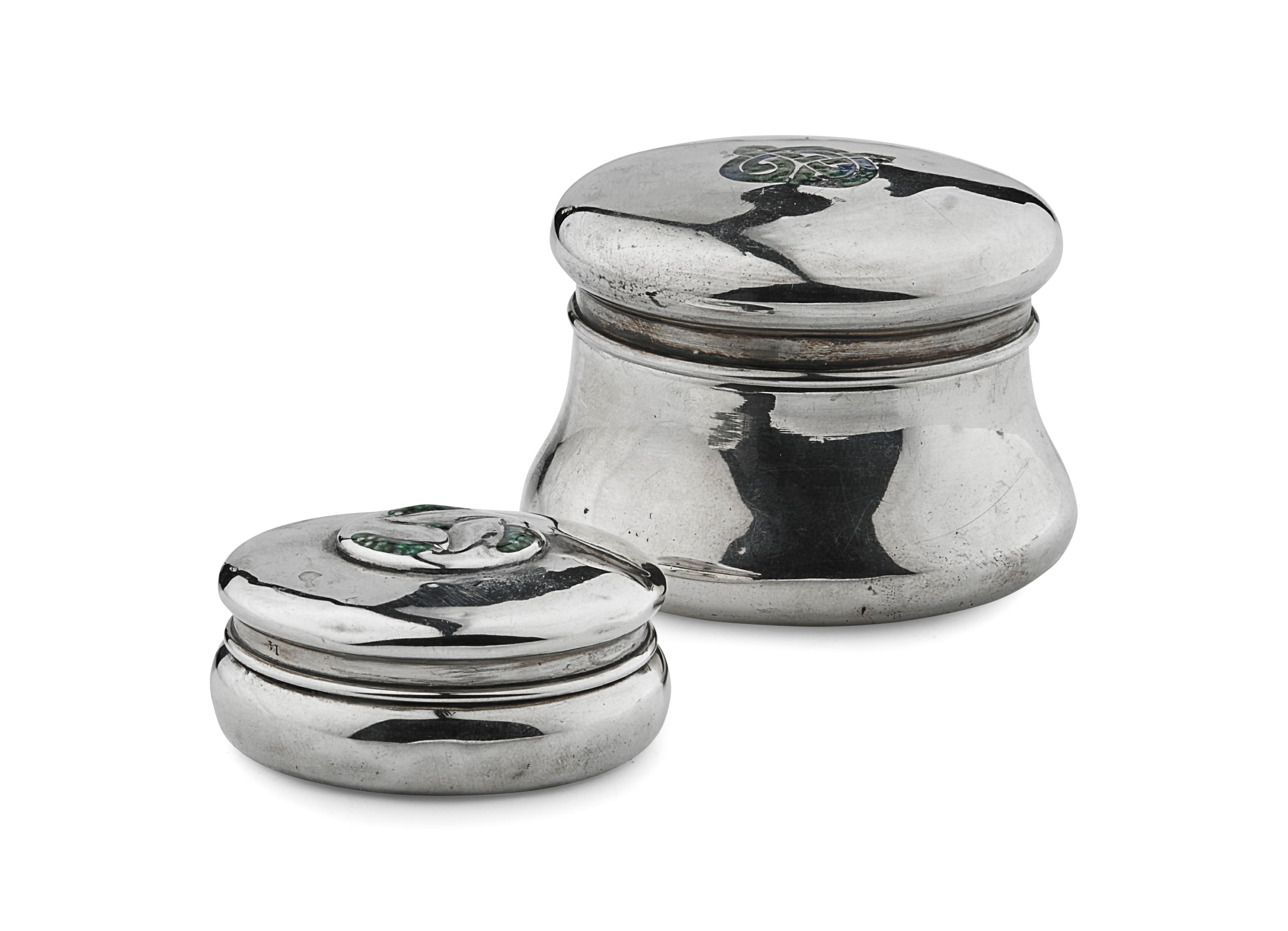 inset to the cover with enamelled Celtic knot, maker's mark L&C/ CYMRIC, hallmarked Birmingham 1904, 6cm diameter, 4cm high; together with an ARCHIBALD KNOX (1864-1933), FOR LIBERTY & CO., LONDON SILVER AND ENAMEL PILL BOX, CIRCA 1905, set with shagreen enamel Celtic boss, maker's mark L&C/ CYMRIC, hallmarked Birmingham 1904, 5cm diameter (2)