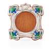 of square outline with shaped corners, decorated with stylised plant form motifs inset with blue and green enamel, on an oak back, with maker's marks and hallmarked London 1903, registered number 404507