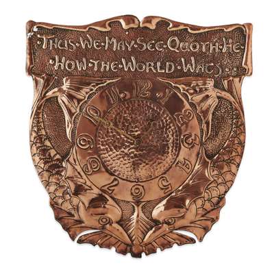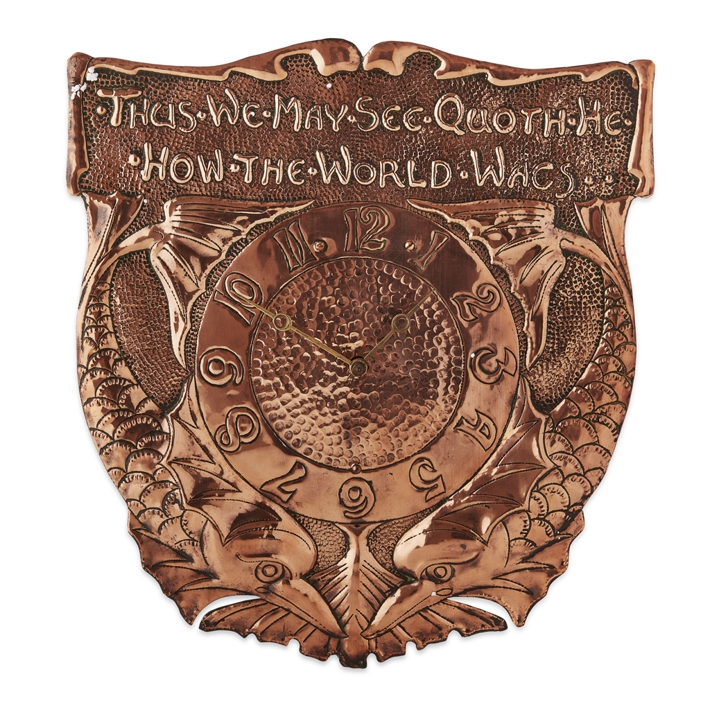 of shaped square form, repousse decorated with opposed fish and bearing inscription THUS WE MAY SEE QUOTH HE/ HOW THE WORLD WAGS, with bob pendulum and weight