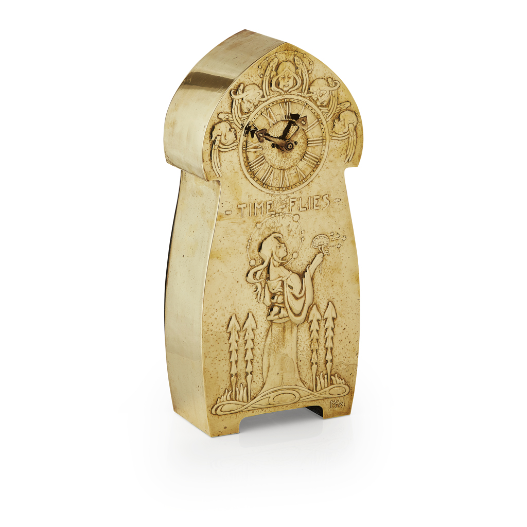 the circular dial with Roman numerals within a pointed arched case repousse decorated with a maiden in a garden with five angels above and bearing the inscription TIME FLIES, bears repousse initials TIME FLIES, later movement