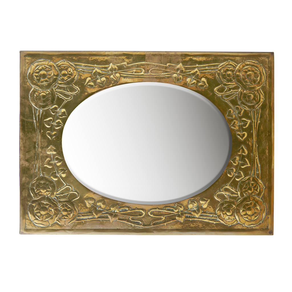 of rectangular form, the frame embossed with stylised roses and ivy, enclosing an oval mirror plate