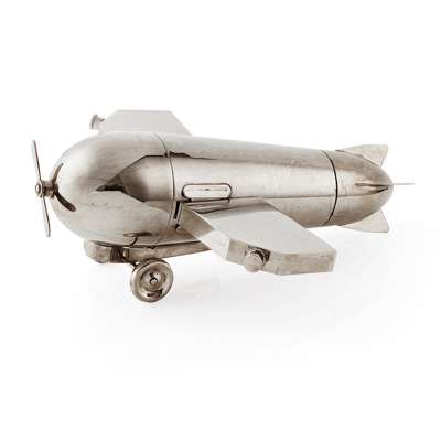 the fuselage containing a screw top flask, cocktail shaker with strainer, four 'tot' cups, and funnel, the undercarriage containing four stirring spoons, the 'wings' formed as removable hip flasks and the tail containing a corkscrew, stamped manufacturer's marks DRGM 894384/J.A. HENCKELS, TWIN WORKS, SOLINSEN, GERMANY