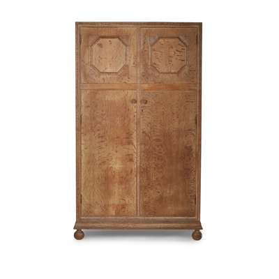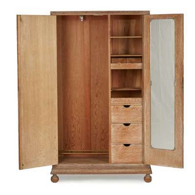comprising a WARDROBE, with fitted interior, bears maker's label, 106cm wide, 185.5cm high, 53cm deep; a DRESSING TABLE, with triptych mirror above an arrangement of five drawers, bears maker's label, 107cm wide, 148cm high, 50cm deep; a BEDSIDE TABLE, with single drawer, 33cm wide, 87cm high, 29.5cm deep; a DRESSING CHAIR, 71cm high; and a SINGLE BED, 92cm wide (5)