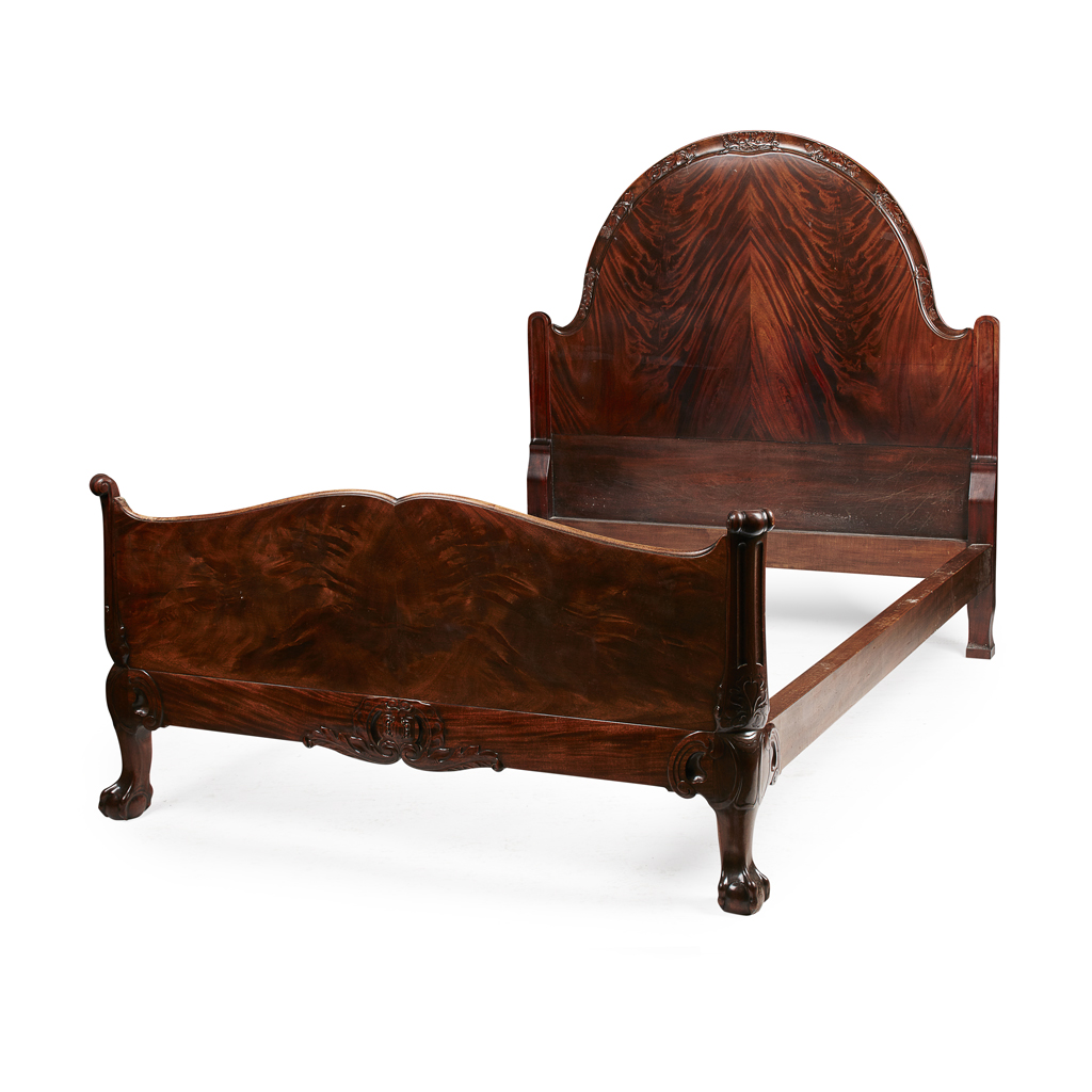 the arched head board with shallow carved frieze of acorns, fruiting vines and hops, the carved side boards supporting a corresponding foot board carved with pomegranate, the whole raised on cabriole legs with ball and claw feet