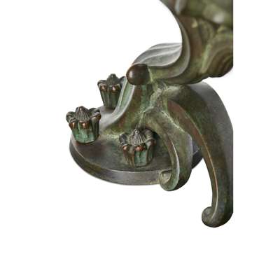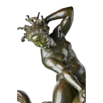 Solglitter, literally Sun Glitter or Sunlight on Water, was sculpted in 1917 when Milles was 42. It is said to have been one of the artists enduring favourites and is one of several works he made around this time that herald the beginning of this mature style. Ancient Greek, Roman and Christian mythology as well as Swedish history were often his sources of inspiration as in this depiction of a Naiad or water spirit riding a dolphin. In Greek mythology Naiads presided over fountains, wells, springs and other bodies of fresh water. Here we see the spirit emerging from the deep for a brief moment, before she disappears again into the mythological underworld, her beautifully detailed wild locks flowing behind her. The figure seems to defy gravity and Milles has perfectly captured the power and movement of the figure, confidently riding the waves and reflecting the rhythmic and expressive aesthetic for which he would become famous. He enjoyed sculpting in heavy materials such as granite and bronze and pairing them with lighter materials such as water and air, by placing them in fountains or raising them up in the air so that they interacted with the sky.