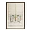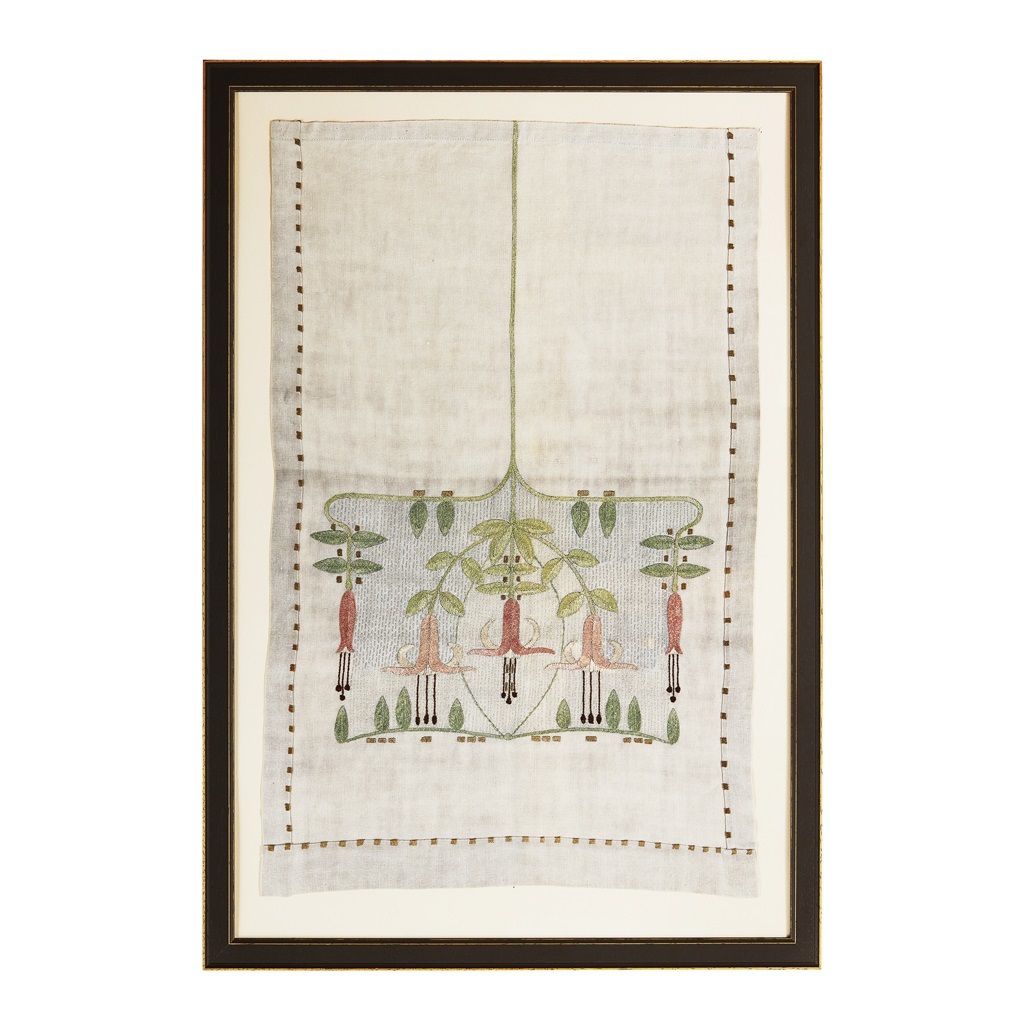 worked in coloured threads with a design of stylised Fuchsias on an unbleached linen ground, framed and glazed
