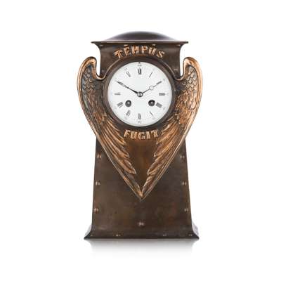 the circular enamelled dial with twin-train movement within tapered square section case with faux rivet detail and with embossed wings, centred with the legend TEMPUS FUGIT, 34cm high; together with a BRASS CHARGER, with repoussé foliate decoration, 42cm diameter (2)