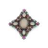 of cruciform outline set with water opals and multi-coloured cabochon stones with painted enamel borders set in a white metal mount with simple pin fastening, in original box with maker's inscription SIBYL DUNLOP LTD/KENSINGTON CHURCH STREET/ W.8.