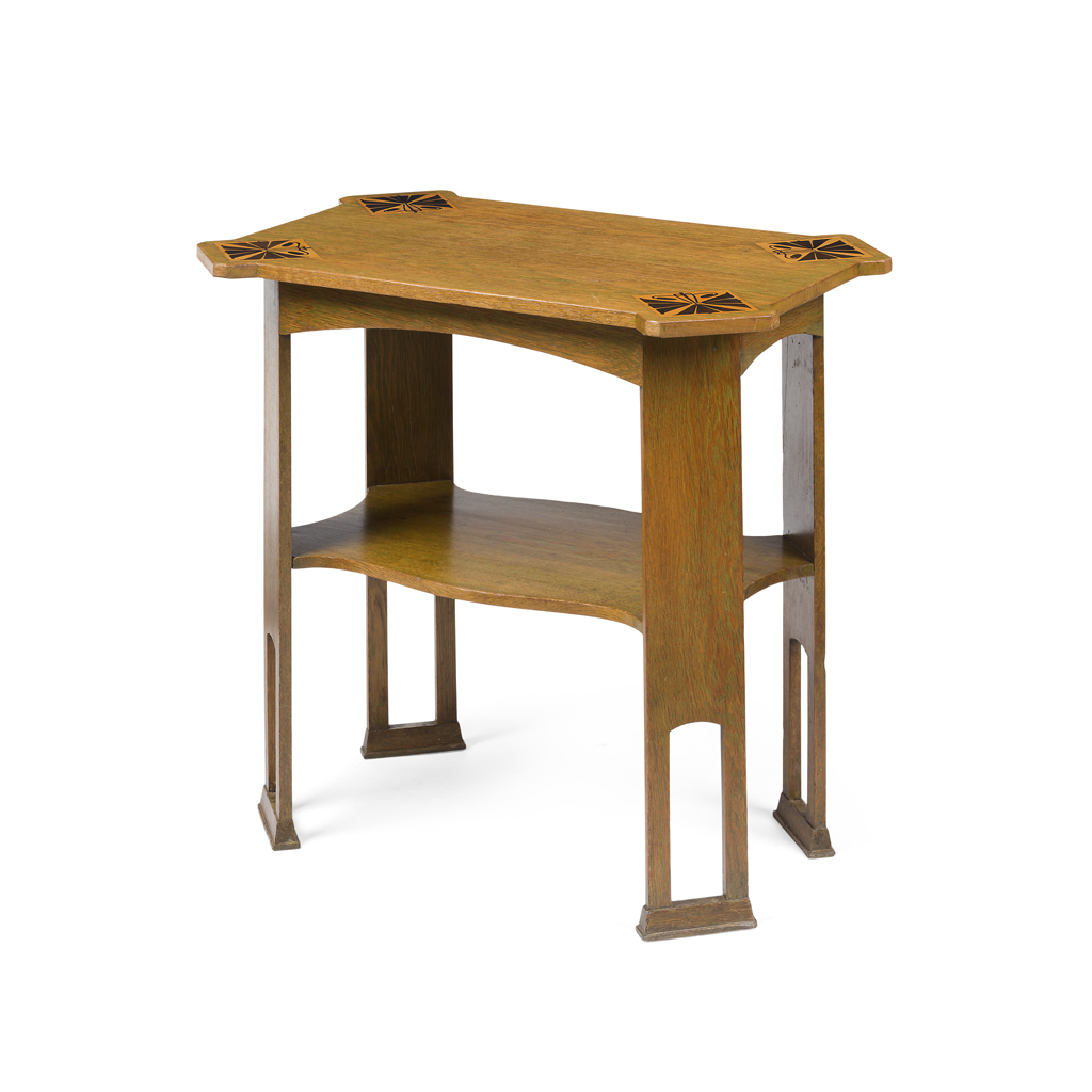 the rectangular canted top, inlaid to the angles with stylised plant forms and raised on pierced plank supports linked by a lower tier