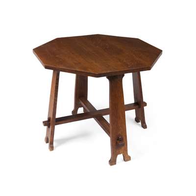 the octagonal top raised above tapered plank supports linked by cross stretchers