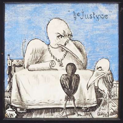 comprised of seven framed tiles, each tile painted in blue and black on a white ground, and comprising; 'Ye Infants'; 'Ye Schoolboye'; 'Ye Lovers'; 'Ye Soldyer'; 'Ye Justyce', 'Ye Pantaloone'; and 'Ye Seconde Childehoode' and contained within original ebonised wood frame
