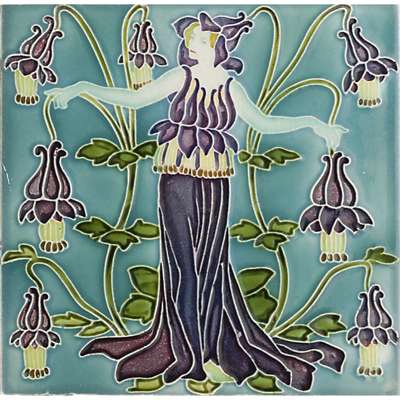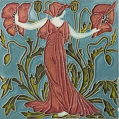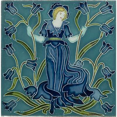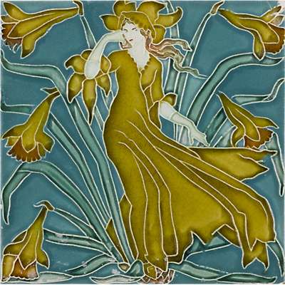 Note: Renowned Victorian artist and illustrator Walter Crane (1845-1915) worked for several manufacturing firms, but most notably for Pilkington's Tile and Pottery Company. Crane began designing interior decoration, wallpapers, tiles and embroidery from the mid-1870s and in 1880 he was made Art Superintendent of London Decorating Company, which specialised in encaustic tiles. The design of these relief-pressed tiles for Pilkington's, which show all the influences of the Art Nouveau, are similar in style to Crane's imaginative book illustrations, on which he built his reputation.